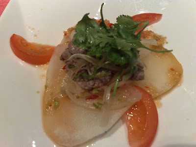 泰式涼拌牛肉:牛肉一般般,但沾醬很好吃,又辣又酸,搭配下面的青木瓜吃,很棒喔
