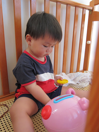 在遊戲床裡玩費雪撲滿小豬、小積木