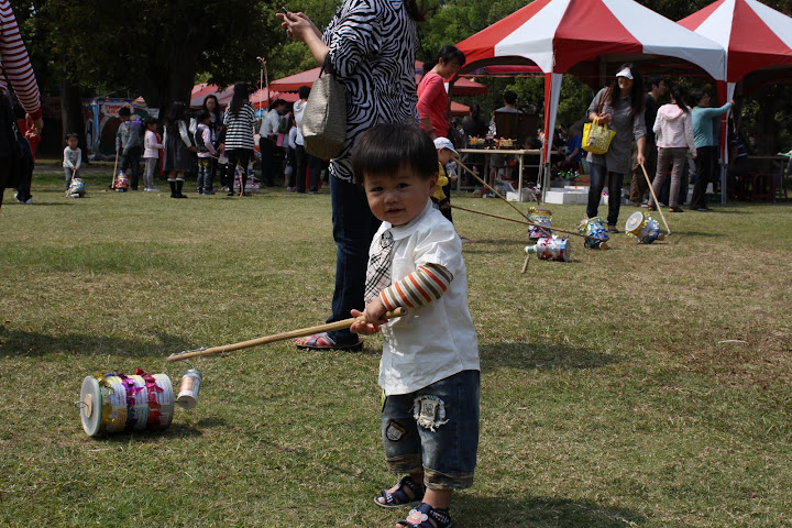 小藍在玩環保童玩,在大太陽底下玩得不亦樂乎