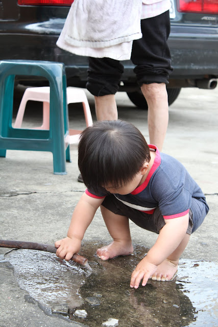 每天洗完澡,阿媽會讓他坐在澡盆裡玩一下水,有時還玩到不想起來擦乾身體