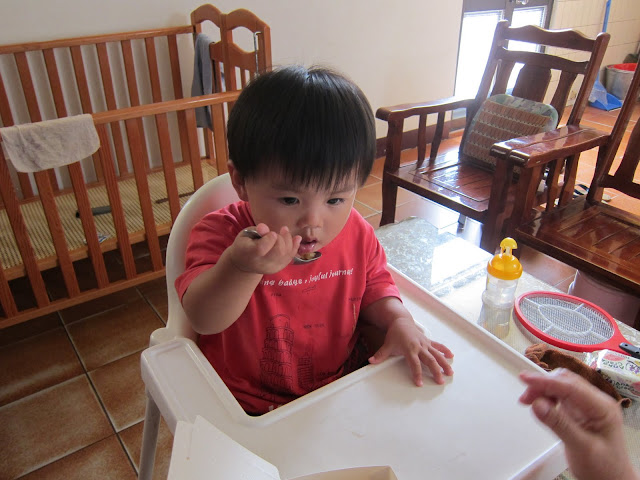 吃飯時,會要求拿湯匙,阿媽會舀東西到湯匙上,讓小藍自己吃