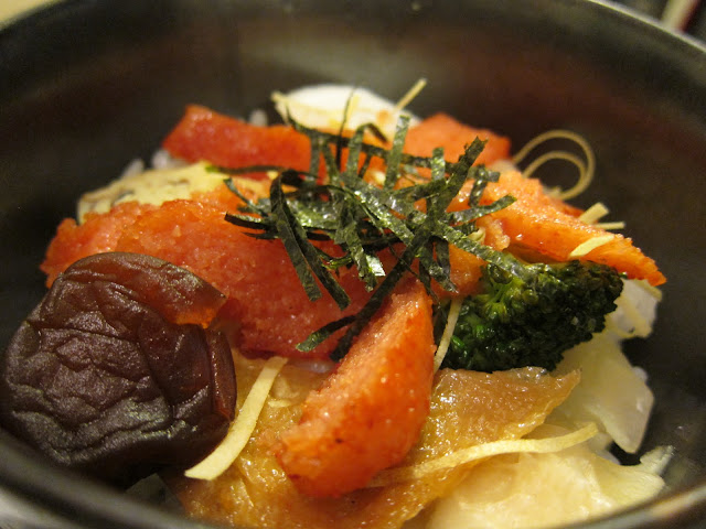 上面大約有4種新鮮的魚肉,還有燙過的青菜、薑片、玉子、醃漬過的梅子、豆皮