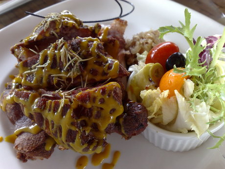3.德國豬腳:看照片大概可以看出個所以然,我們一致覺得,這個豬腳應該是放了一陣子後才送上來,因為溫度不熱、上面的醬看起來似乎有點乾掉,而且,好像烤過頭,豬肉變得很乾、硬