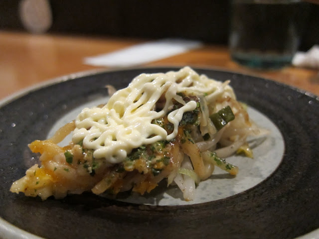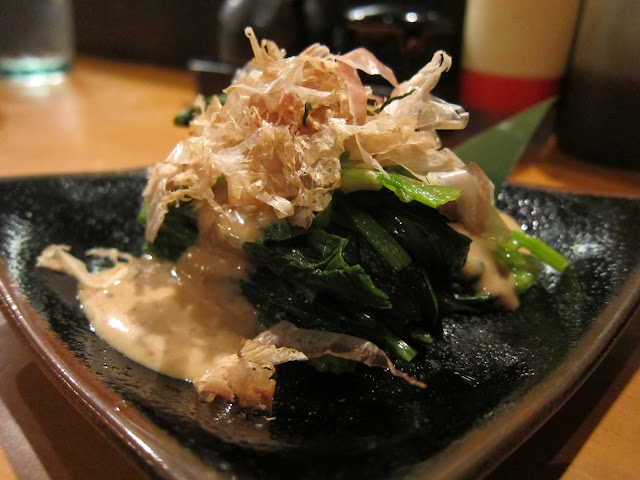 菠菜燙過,淋上胡麻醬和柴魚片,不錯吃,是道在家也可以試著做做看的小菜